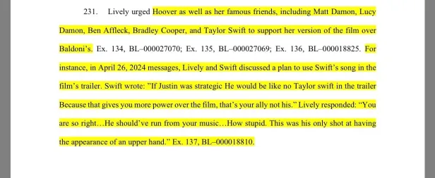 The filing also includes alleged messages Lively sent to Swift after an encounter involving Baldoni. In one, Lively wrote that Swift was “so epically heroic today” and said she had “recapped every moment” to her husband, Ryan Reynolds. She added, “I kept remembering stuff- You making s— up about me and lenses. And referring to yourself as my doll.