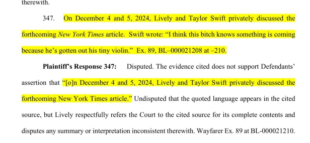 Swift allegedly responded, “I’ll do anything for you !!” Lively’s attorneys disputed that this meant Swift “agreed to do Lively’s bidding,” “met with Baldoni,” or “endorsed the revised draft.” They added, “Lively respectfully refers the Court to the cited source for its complete contents and disputes any summary or interpretation inconsistent therewith.”