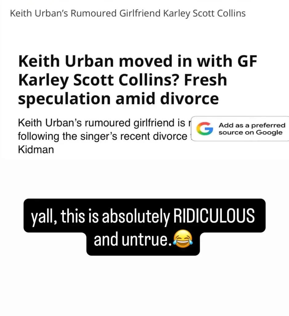 Rising country singer Karley Scott Collins has publicly denied claims that she is romantically involved with Keith Urban or that the two are living together, calling the reports completely false. Collins, 26, addressed the speculation directly on Instagram Stories on January 18 after an online article suggested Urban had moved in with her following his divorce from Nicole Kidman.